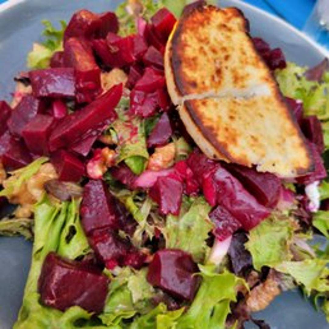 A vibrant and refreshing salad showcasing earthy roasted beets, combined with crisp mixed greens, crumbled feta cheese, and crunchy walnuts. Dressed lightly with a zesty lemon-dill vinaigrette, offering a delightful balance of sweet, savory, and tangy notes.