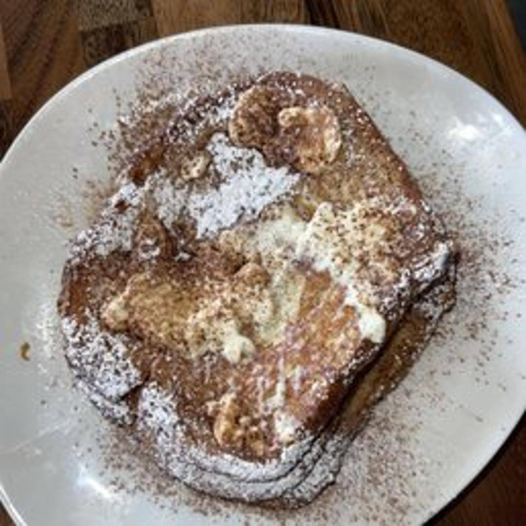 A smaller portion of our Tiramisu French Toast. Classic french toast soaked in coffee liquor and mascarpone mix, served with whipped cream and cocoa powder.