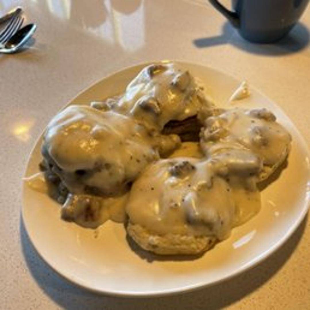 House made buttermilk biscuits, split and topped with sausage gravy, poached eggs, and a sprinkle of black pepper.