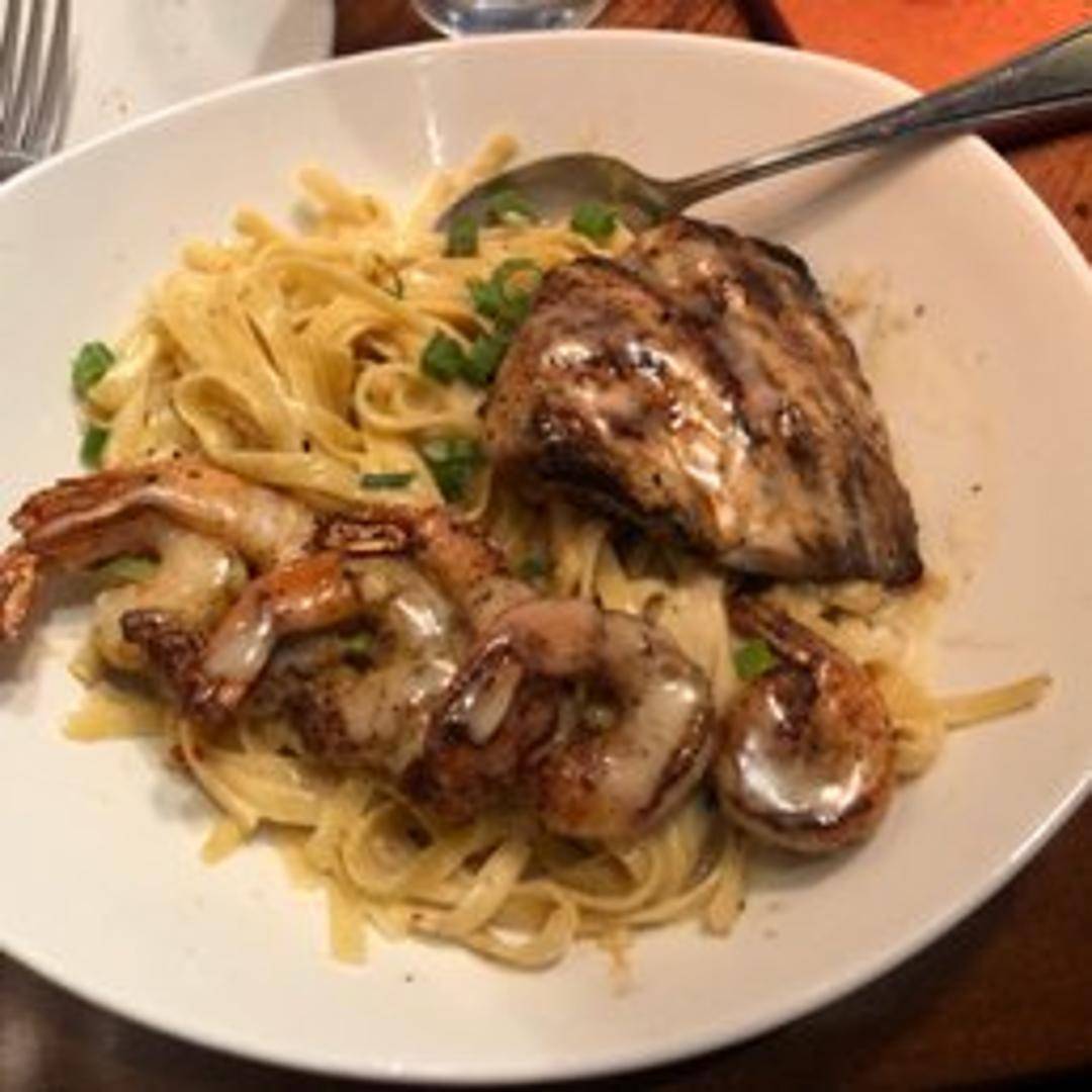Grilled chicken and shrimp over fettuccine noodles tossed in a creamy Parmesan cheese sauce. Garnished with parsley.