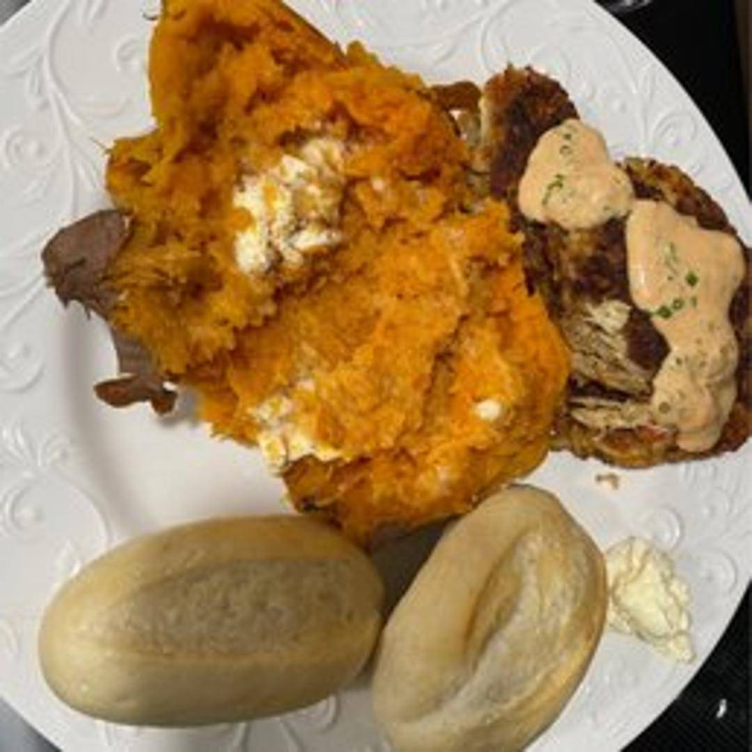 Two Maryland-style crab cakes, pan-seared to golden perfection. Served with a zesty remoulade sauce and your choice of two sides.