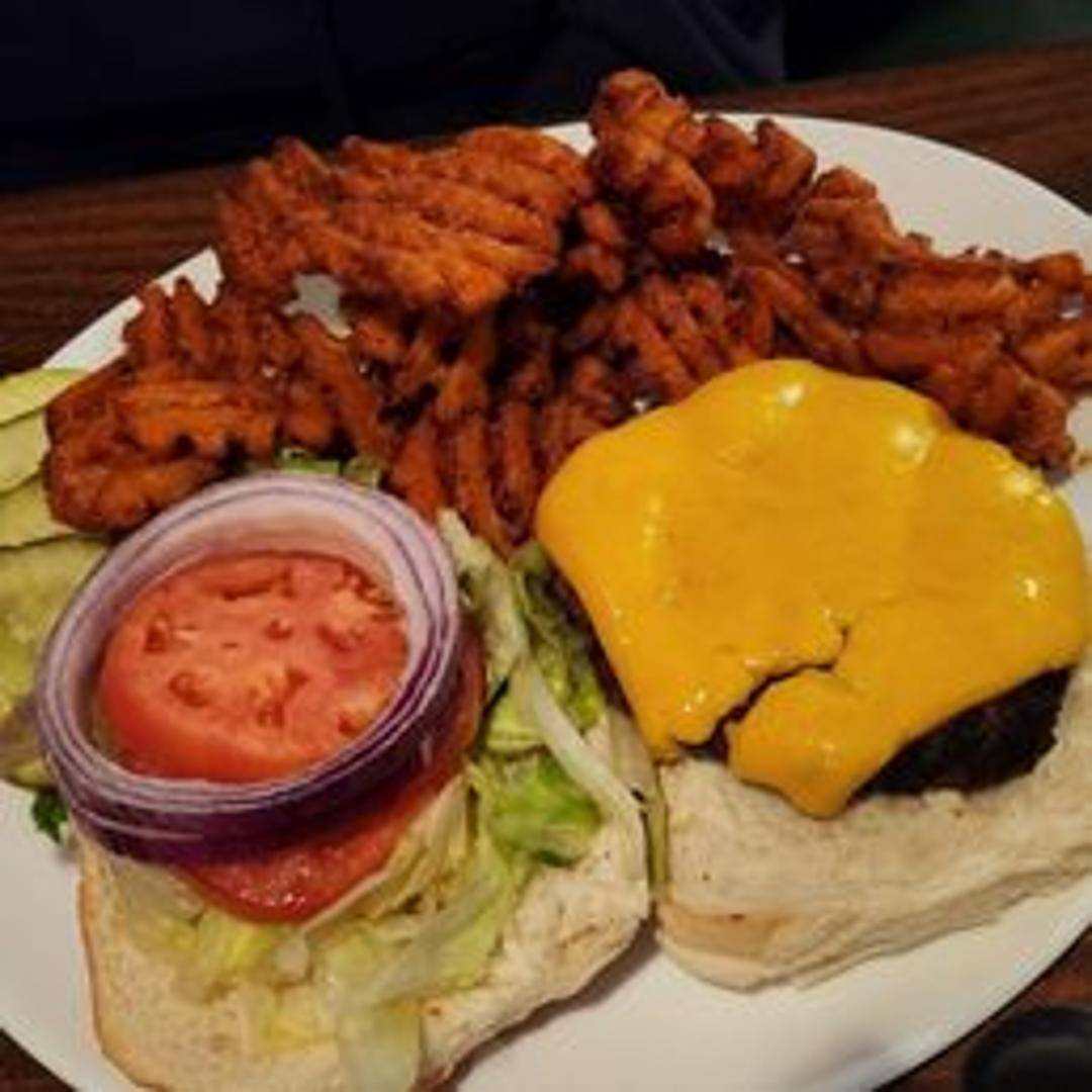 A classic cheeseburger featuring a juicy, perfectly cooked beef patty topped with melted cheese. Served on a toasted bun. Includes standard toppings like lettuce, tomato, onion, and pickles. Condiments available.