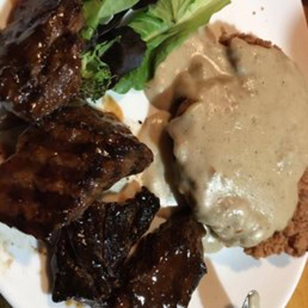 A boneless, skinless chicken breast, breaded and fried to a golden crisp. Served with mashed potatoes, country gravy, and your choice of vegetable.