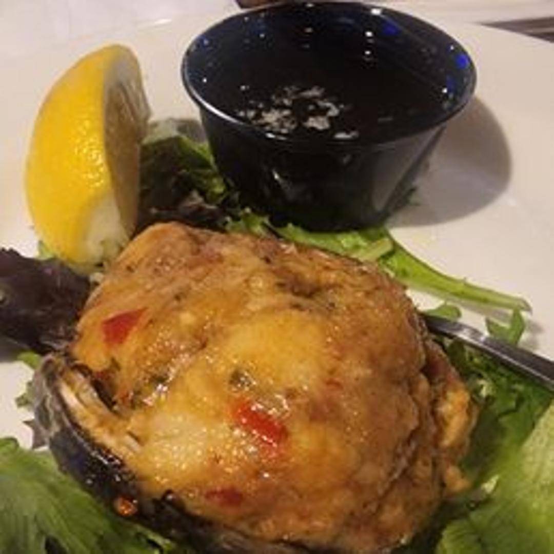 A large, baked quahog clam shell filled with a savory mixture of chopped clams, breadcrumbs, herbs, and spices. Served hot.