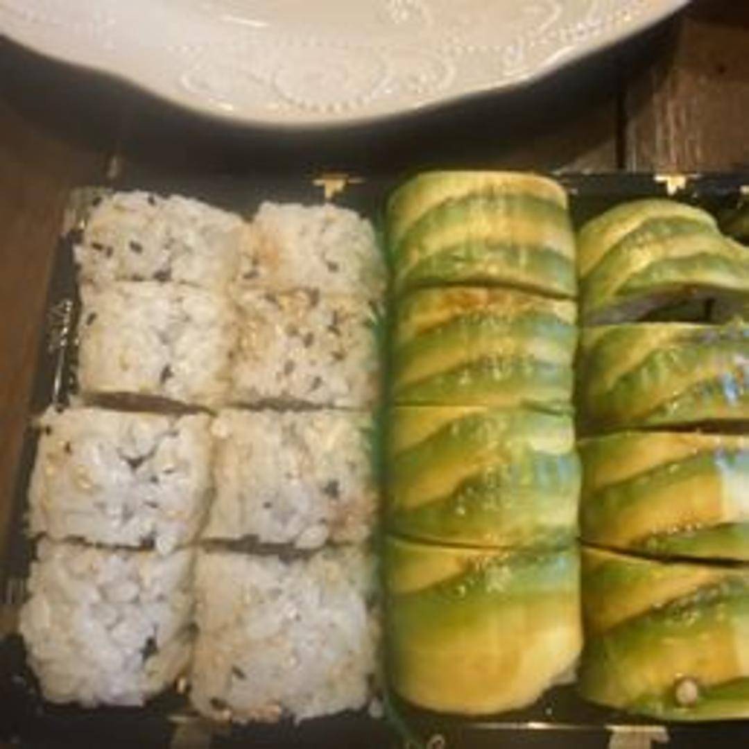 A sushi roll featuring eel (unagi) and cucumber, topped with slices of avocado that resemble a caterpillar. Often drizzled with eel sauce (unagi sauce) and sesame seeds.