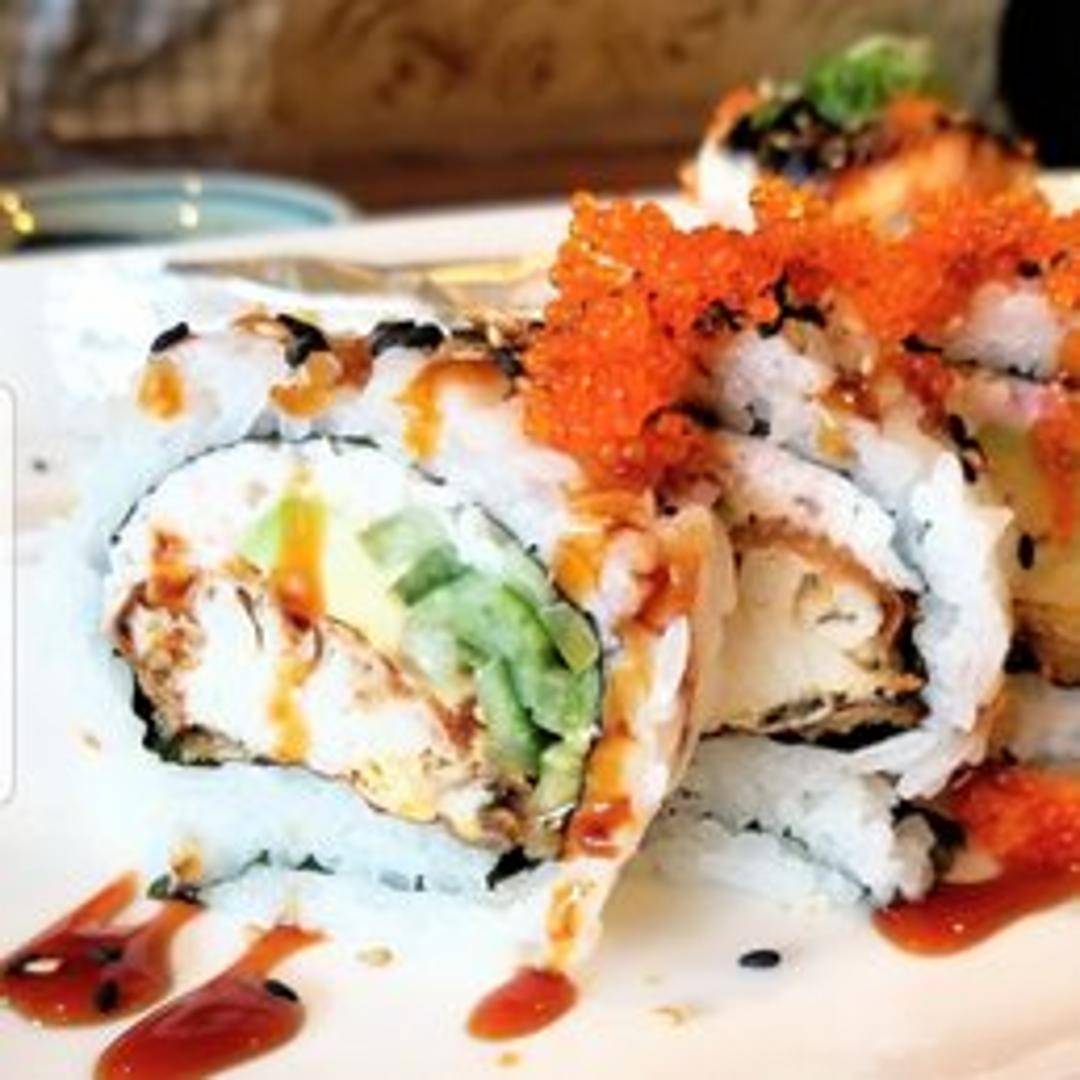 Tempura soft-shell crab, avocado, cucumber, sprouts, and masago rolled in seaweed and rice. Served with eel sauce.