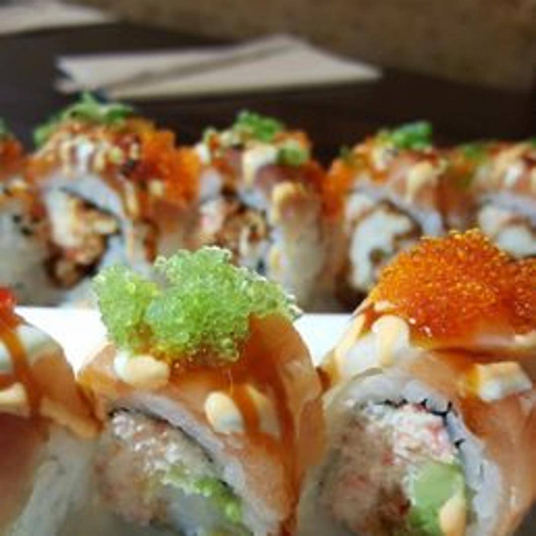 Crab mix, avocado, cucumber inside, topped with salmon, thin slices of lemon, and a special sauce.