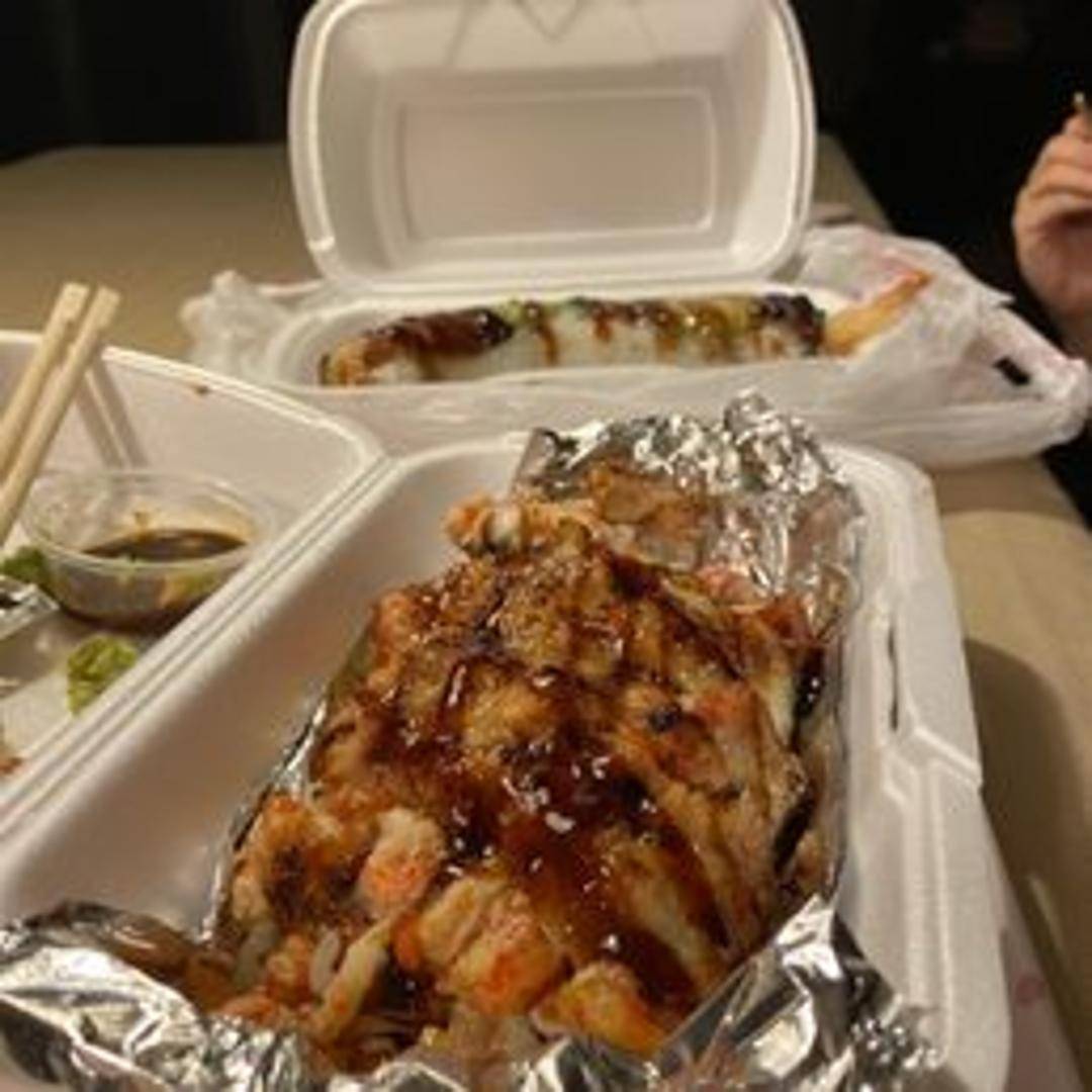 Shrimp tempura and cucumber roll topped with salmon, thinly sliced lemon, and a special sauce, then torched.