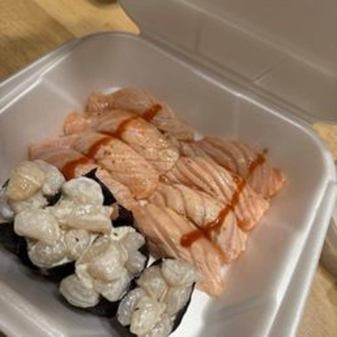 Fresh, thinly sliced salmon served over a bed of seasoned sushi rice. A simple yet flavorful offering, highlighting the natural taste and texture of the salmon.