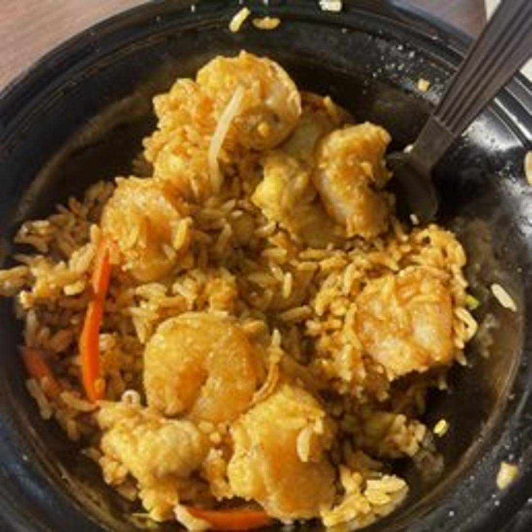 Wok-tossed rice with shrimp, vegetables, egg, and soy sauce.
