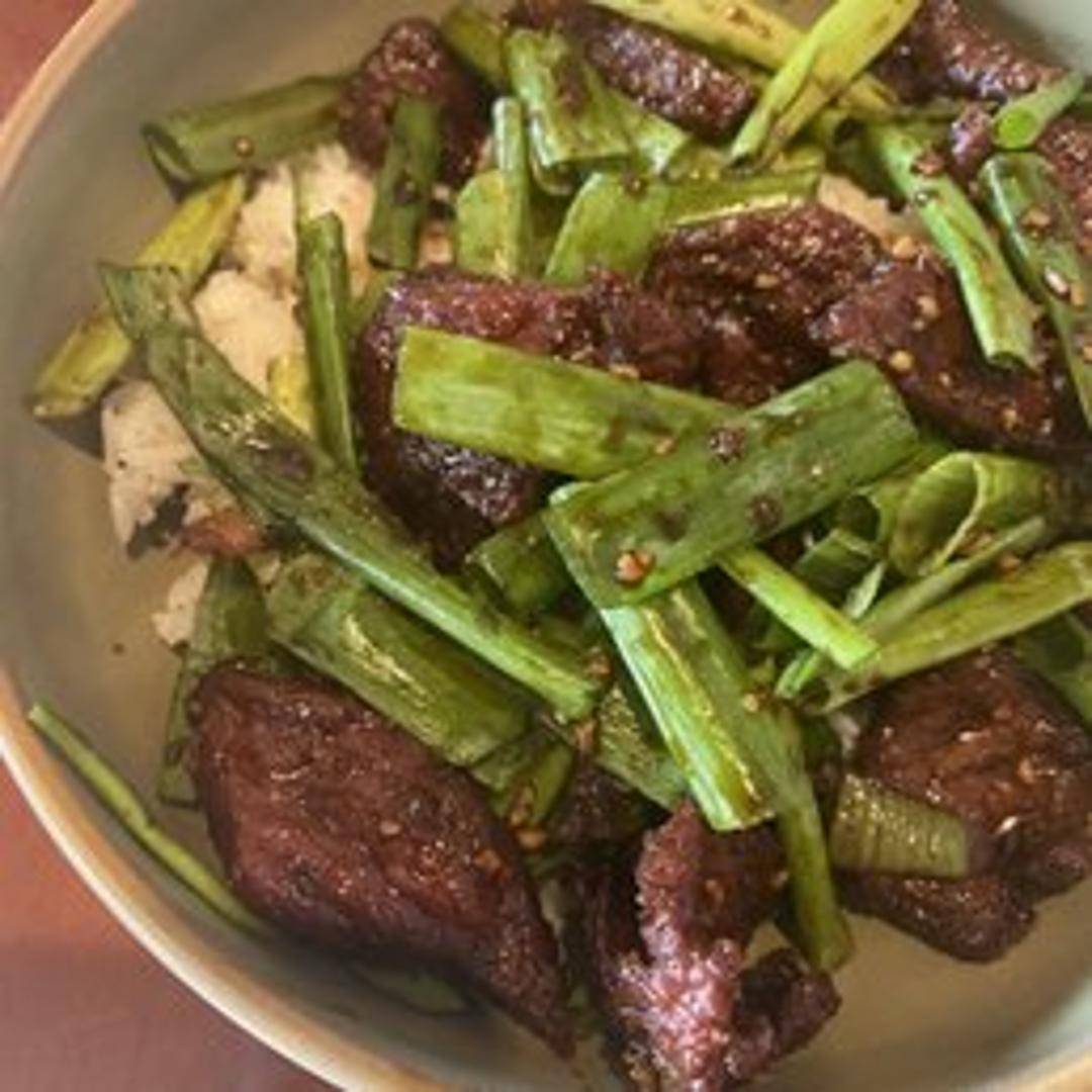 Stir-fried sliced beef with scallions and garlic in a sweet and savory Mongolian sauce. Served with white or brown rice.