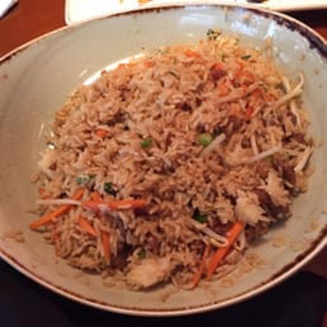 Wok-tossed rice with savory pork, eggs, carrots, peas, and scallions in a light soy sauce.