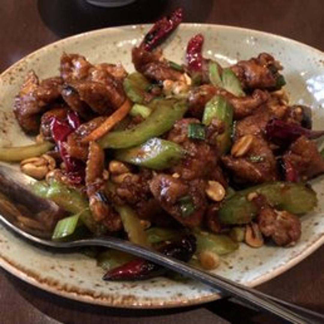 Wok-tossed chicken with peanuts, vegetables, and chili peppers in a spicy Kung Pao sauce.