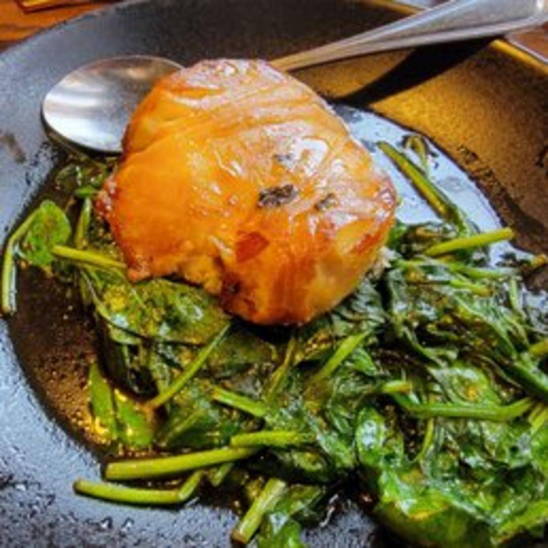 Mild, flaky Chilean sea bass marinated in fragrant oolong tea, pan-seared and served with a delicate ginger-soy glaze, complemented by seasonal vegetables and a bed of steamed spinach. Garnished with scallions.