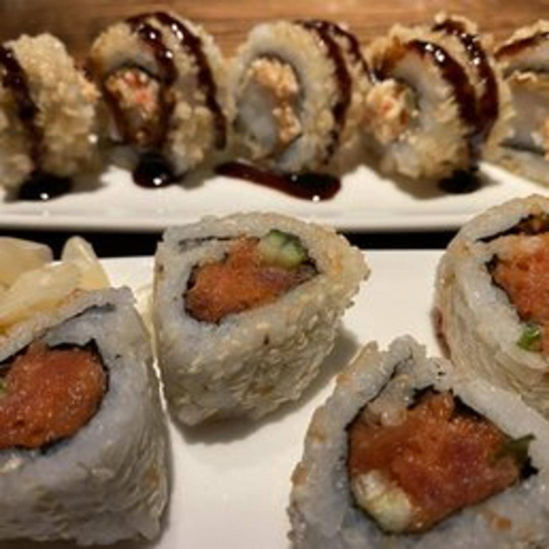 Sushi roll filled with spicy tuna, cucumber, and avocado. Topped with spicy mayo and sesame seeds. Served with wasabi and ginger.