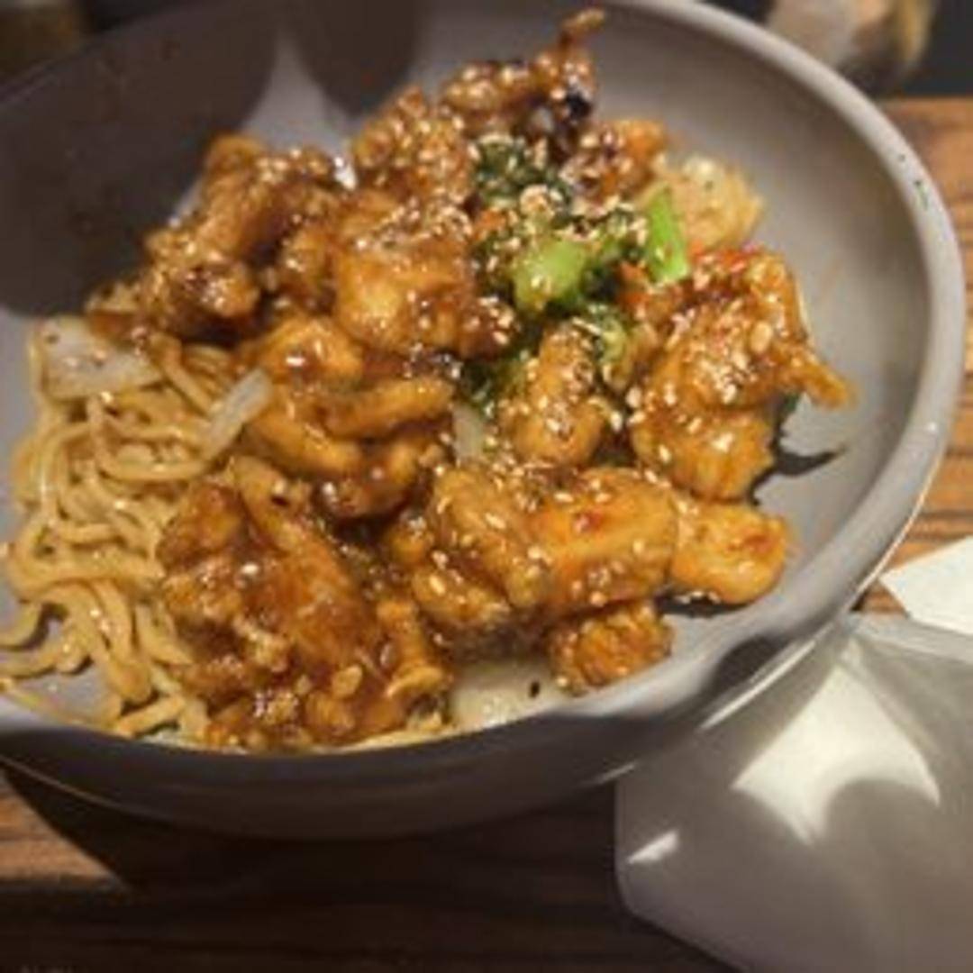 Crispy chicken tossed in a sweet and savory sesame sauce. Served with steamed rice and garnished with sesame seeds and green onions.