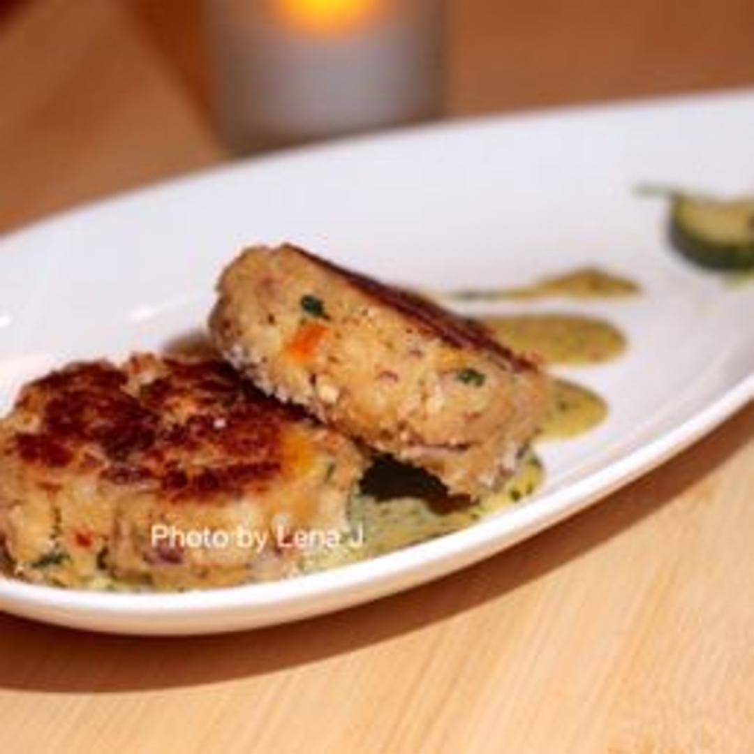 Delicate crab cakes infused with the vibrant flavors of Southeast Asia. These crabcakes are made with a blend of fresh crab meat, aromatic herbs, and spices, pan-seared to a golden brown. Served with a complementary dipping sauce.