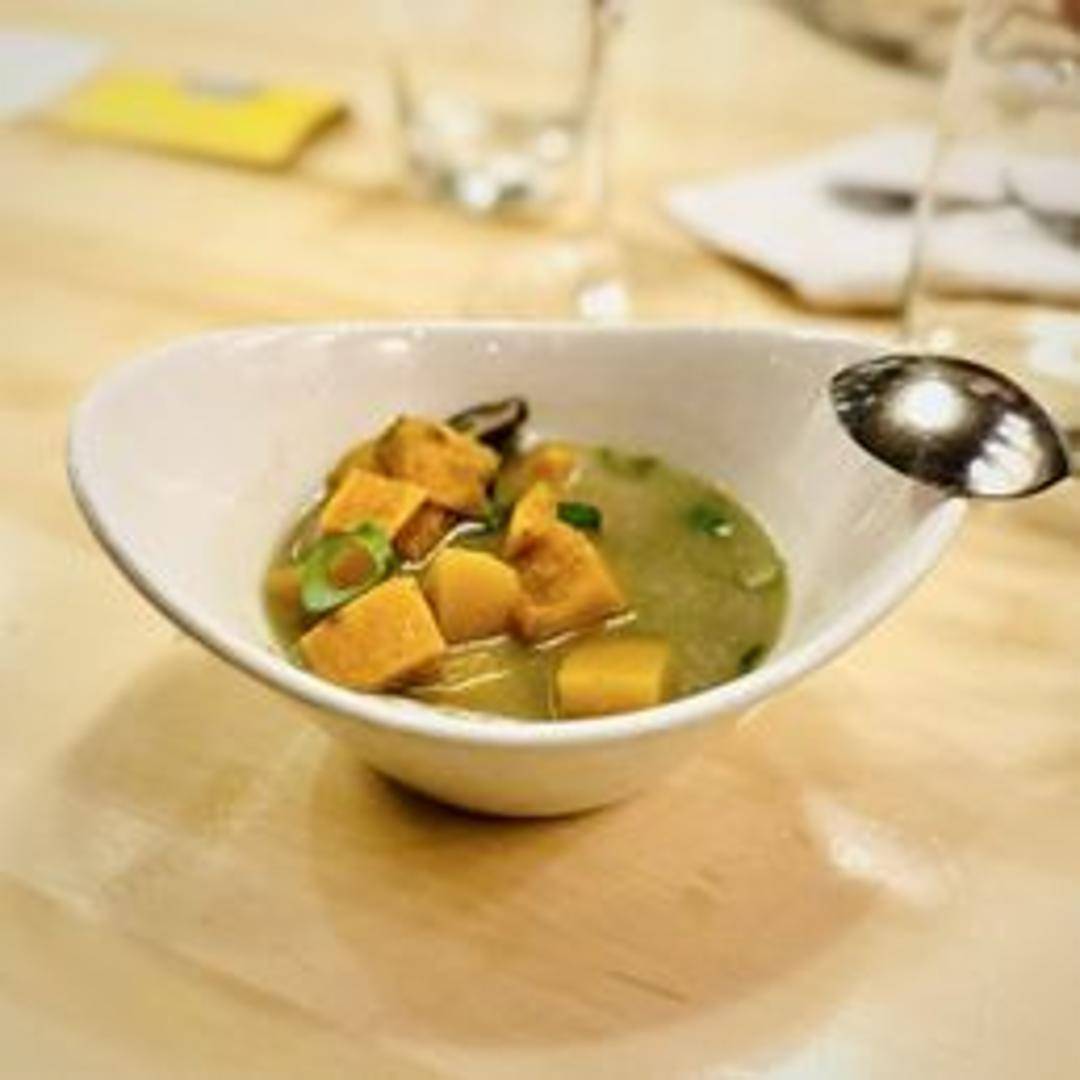 A creamy and aromatic soup featuring coconut milk, fragrant curry spices, and fresh vegetables. Often contains tofu or other protein options. Garnished with fresh herbs and a squeeze of lime.