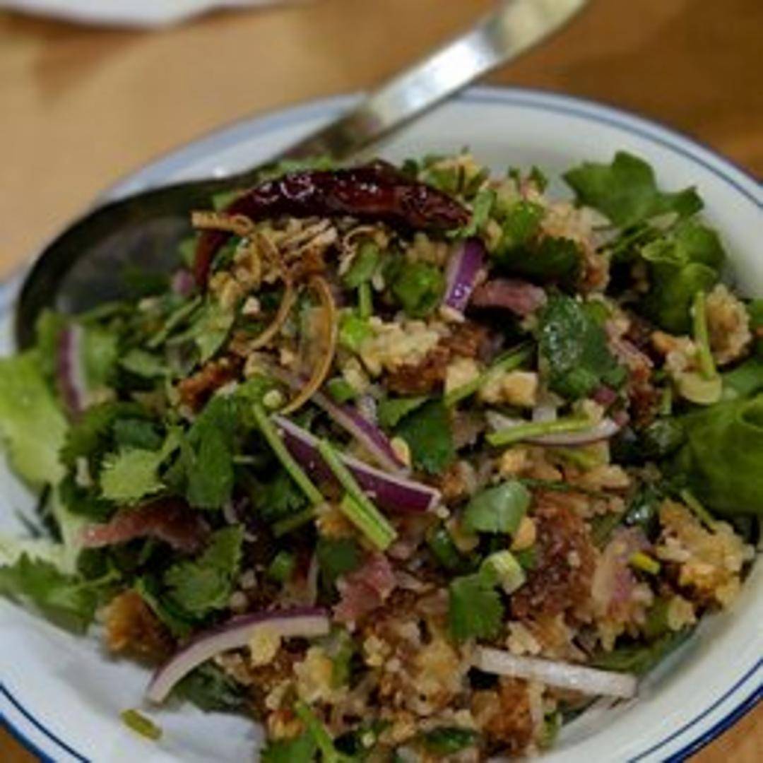A signature Laotian delight, Nam Khao is a textural and flavorful masterpiece. Crispy, deep-fried curried rice balls are crumbled and mixed with tangy sour pork sausage (som moo), roasted peanuts, shredded coconut, and a medley of fresh herbs like cilantro and mint, all dressed in a zesty lime and chili vinaigrette. Served with fresh lettuce for wrapping, it's an explosion of savory, sour, and spicy tastes.