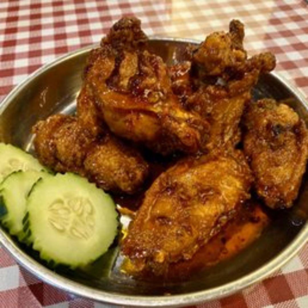 Crispy fried chicken wings, marinated in a flavorful blend of traditional Laotian and Thai spices, offering a perfect balance of savory and aromatic notes. Often served with a sweet and spicy dipping sauce, these wings are a popular appetizer, boasting a golden-brown exterior and juicy, tender meat.