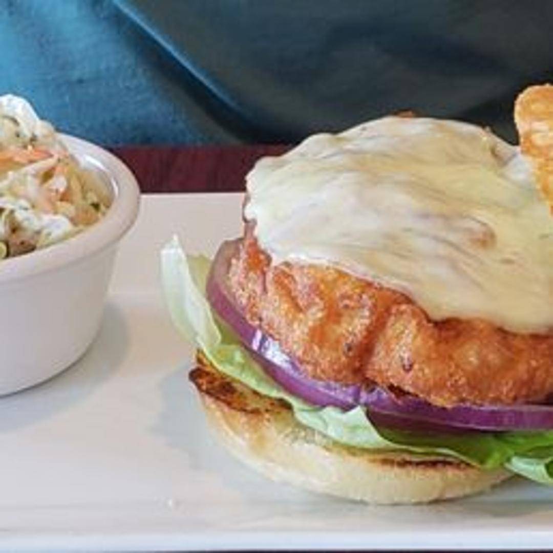 Crispy, golden-fried chicken breast served on a toasted brioche bun with lettuce, tomato, pickles, and your choice of sauce. Served with your choice of side.