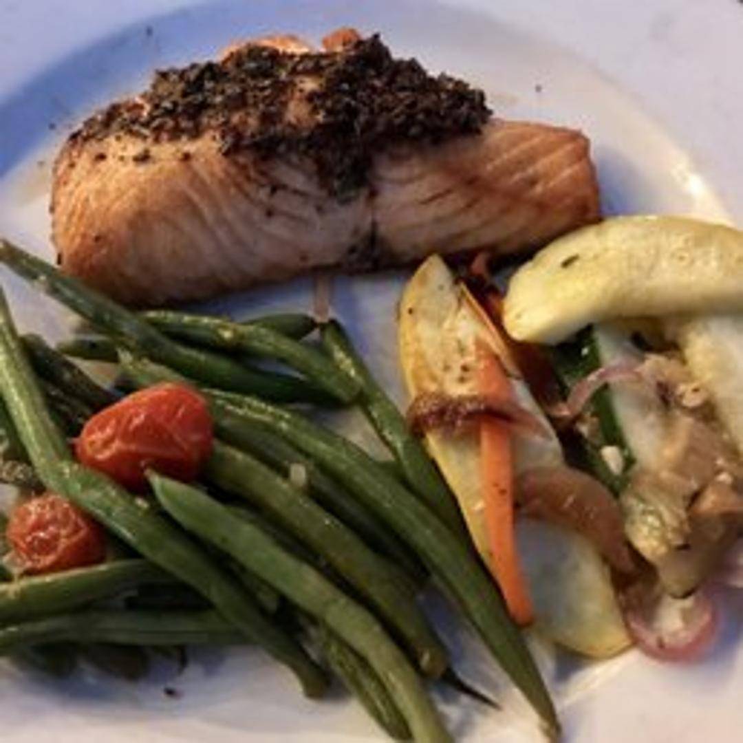 Fresh Atlantic salmon fillet, grilled to perfection and served with your choice of two sides. Options may include seasonal vegetables, rice pilaf, mashed potatoes, or french fries. Garnished with lemon and fresh herbs.