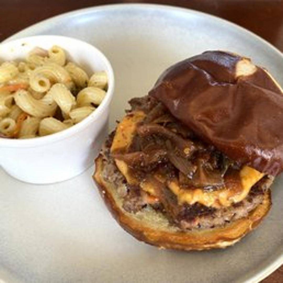Our classic burger smothered in creamy, homemade pimento cheese, topped with crisp lettuce and ripe tomato, served on a toasted brioche bun. Comes with your choice of side.