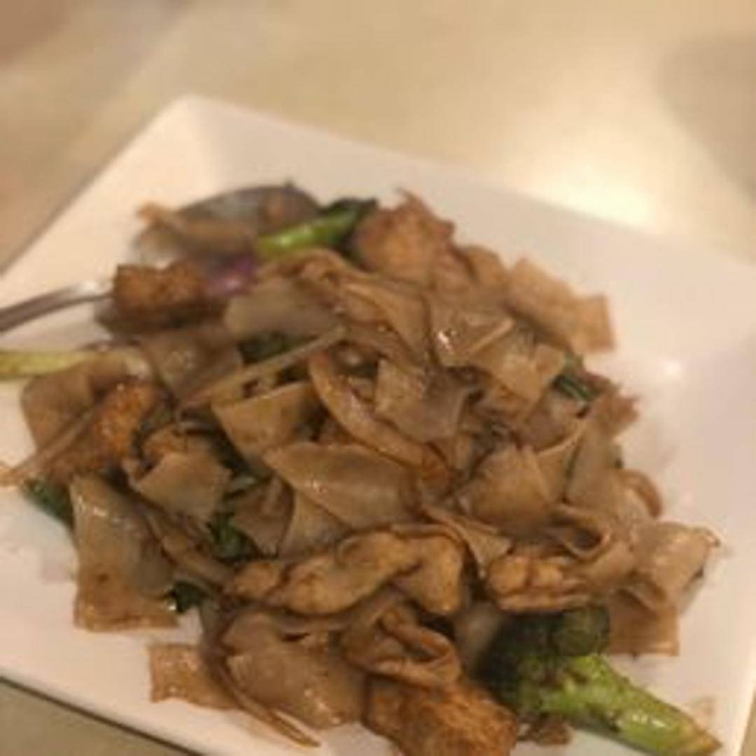 Wide rice noodles stir-fried with chili, garlic, bell peppers, onions, tomatoes, basil, and your choice of protein in a savory and slightly spicy sauce.