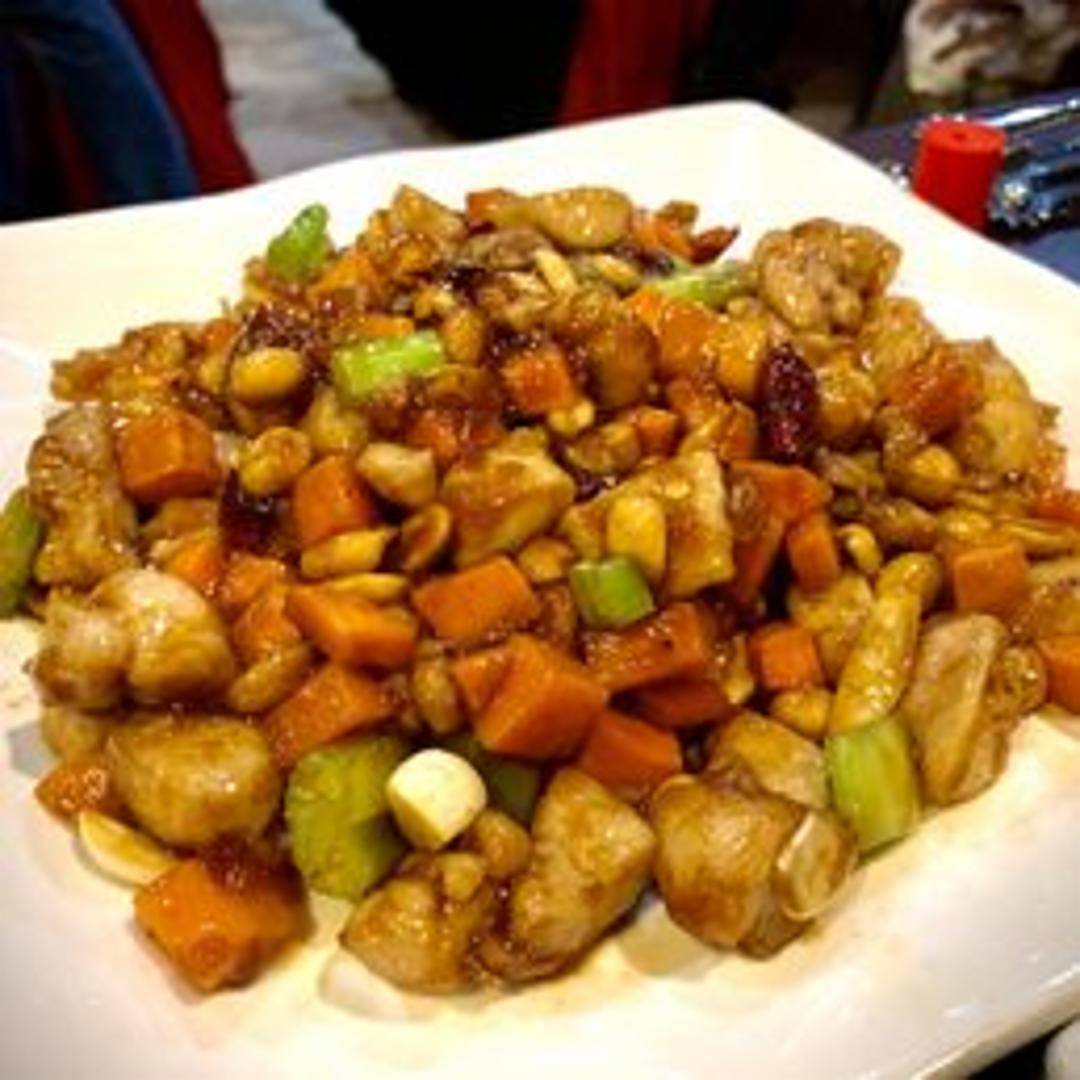 A vibrant and spicy Szechuan-style dish, featuring diced chicken stir-fried with roasted peanuts, dried chili peppers, and an array of colorful vegetables such as bell peppers. It's all tossed in a bold, complex sauce that balances sweet, sour, and savory notes, often with a signature tingle from Sichuan peppercorns.