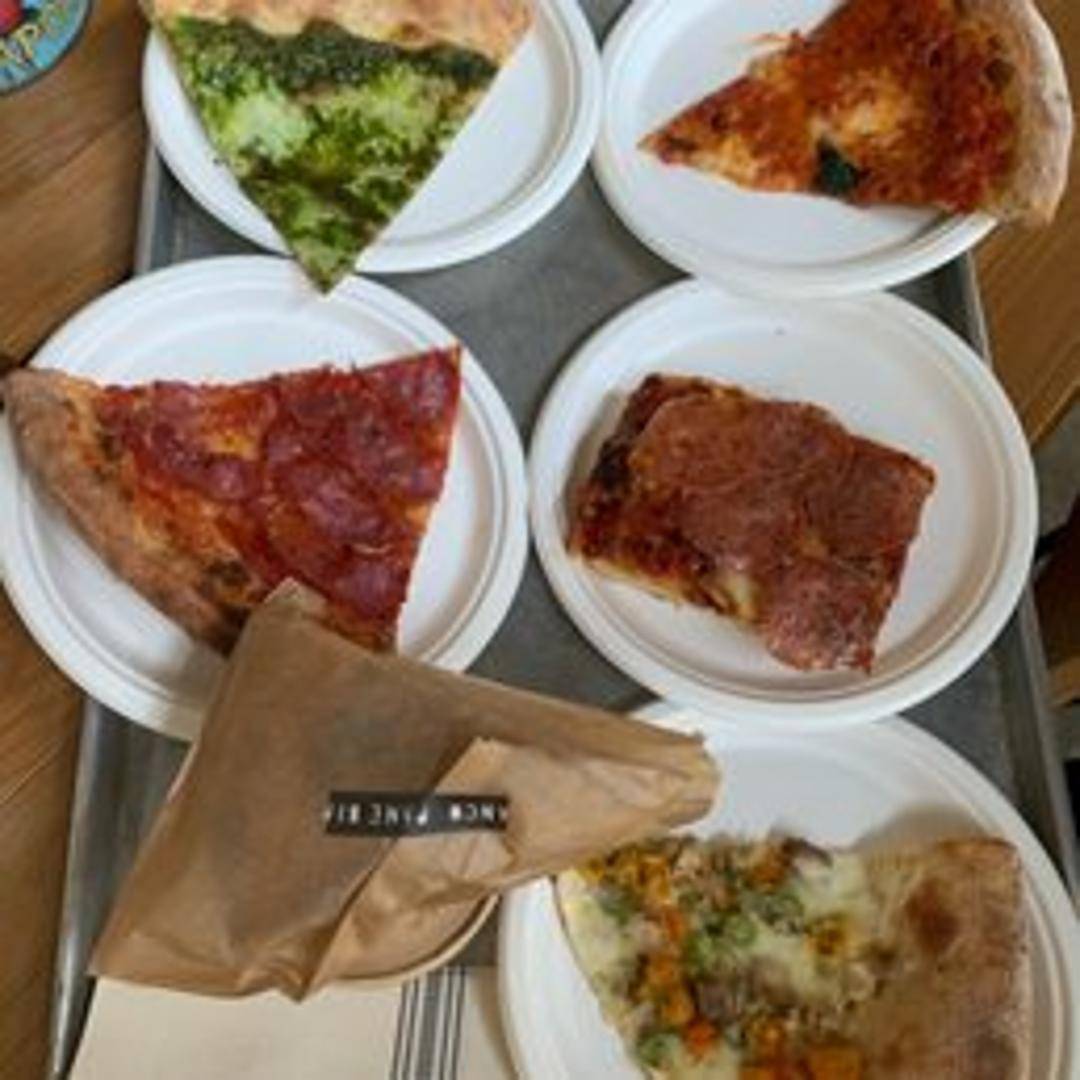 A daily rotating selection of pizza by the slice, featuring seasonal ingredients sourced from local markets. The toppings and style will vary each day, showcasing the freshest produce available. Expect a unique and flavorful experience.