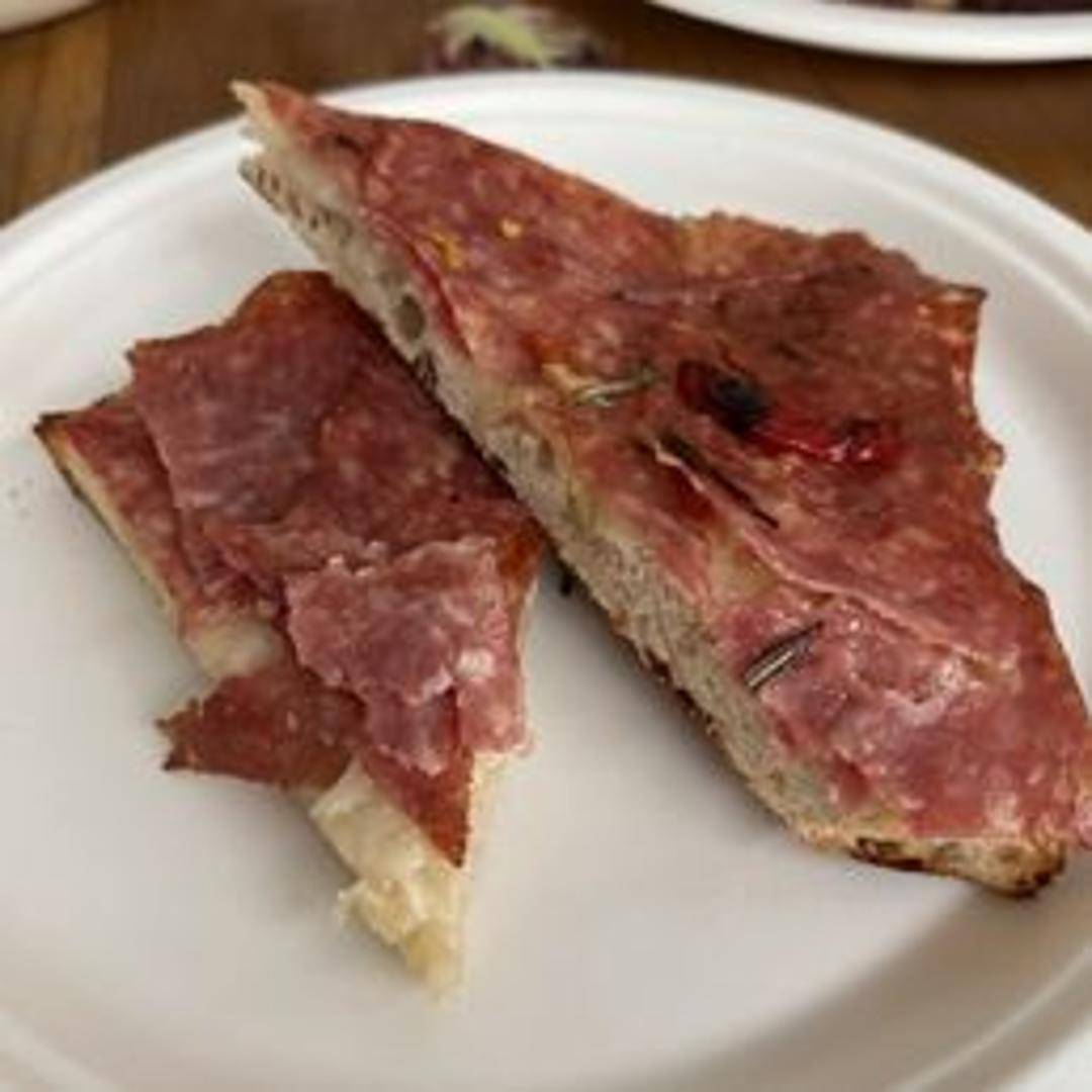 Rectangular slices of pizza baked on a peel ('alla pala'). Variety of toppings available daily. Features a thick, airy crust made from high-hydration dough.