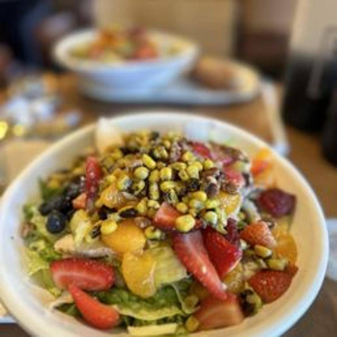 Chicken raised without antibiotics, crisp Fuji apples, celery, red onion, toasted pecans, and a sweet signature dressing on a bed of greens.