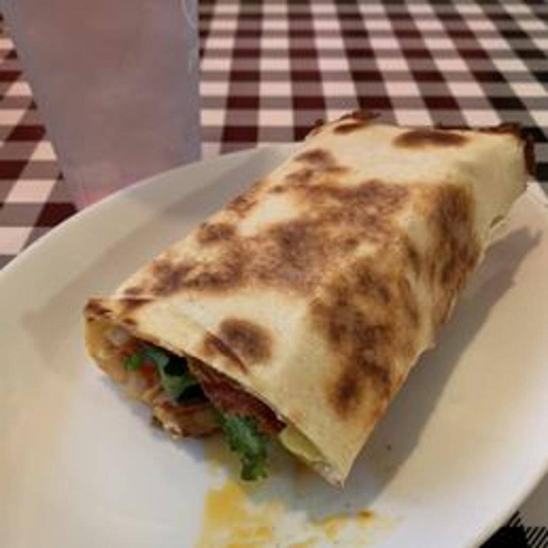 A warm, toasted panino filled with ham, salami, pepperoni, provolone cheese, lettuce, tomato, onion, banana peppers, and Italian dressing.