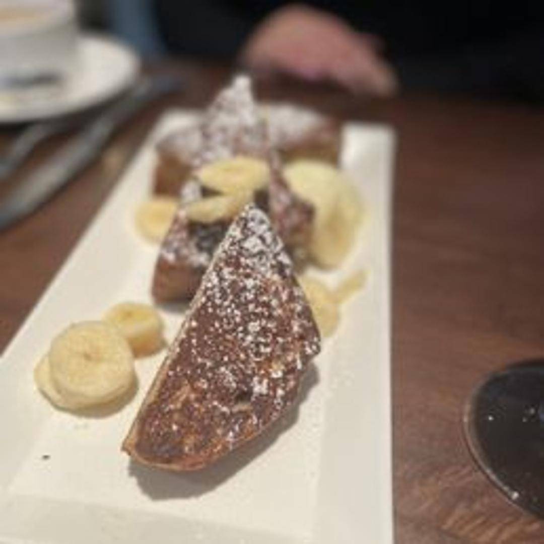 Thick slices of house-made banana bread dipped in a rich custard and grilled to perfection. Served with caramelized bananas, toasted pecans, and a drizzle of maple syrup.