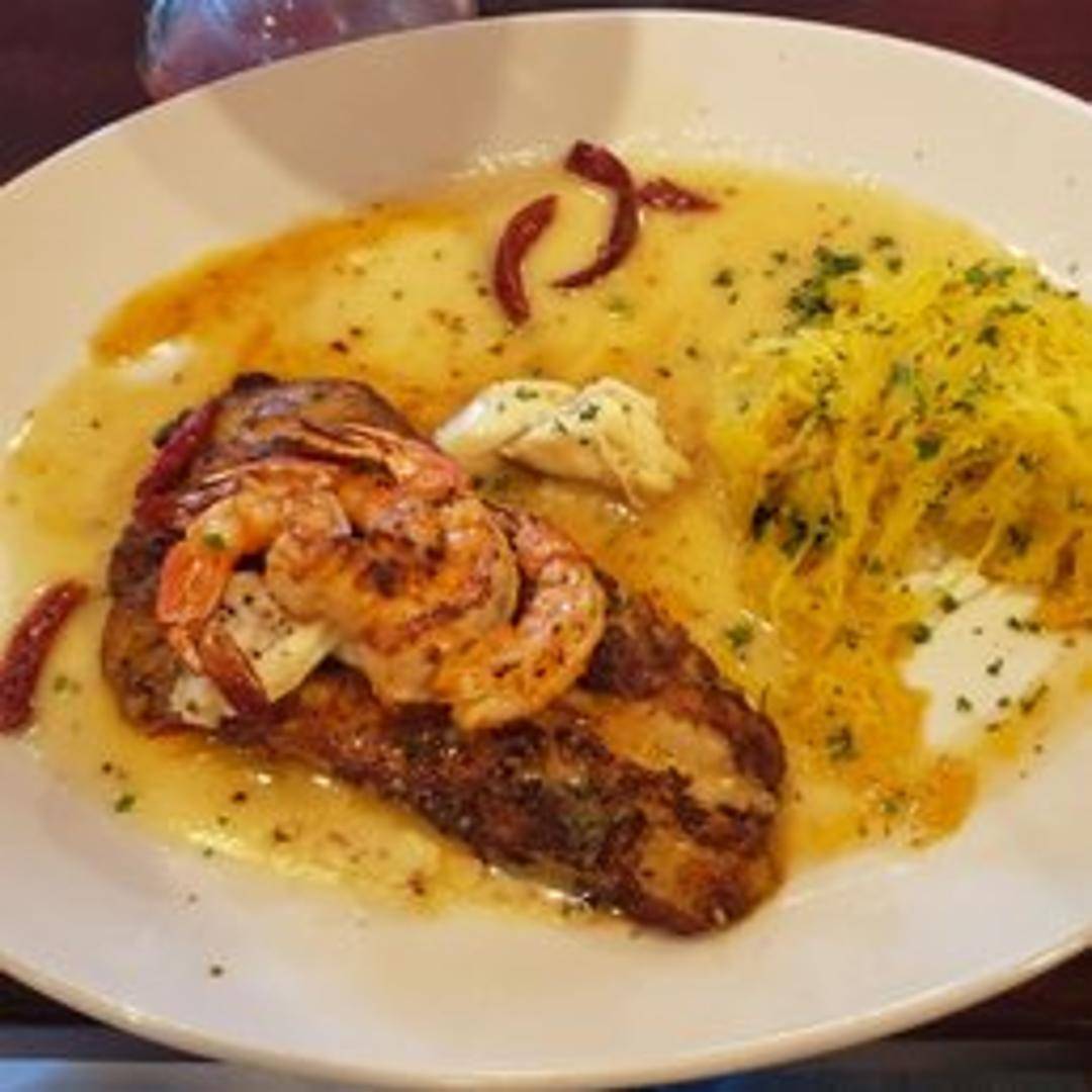 Perfectly grilled fresh tilapia fillet, delicately topped with a generous mound of sweet jumbo lump crab meat, drizzled with a rich lemon butter sauce and served with seasonal vegetables.