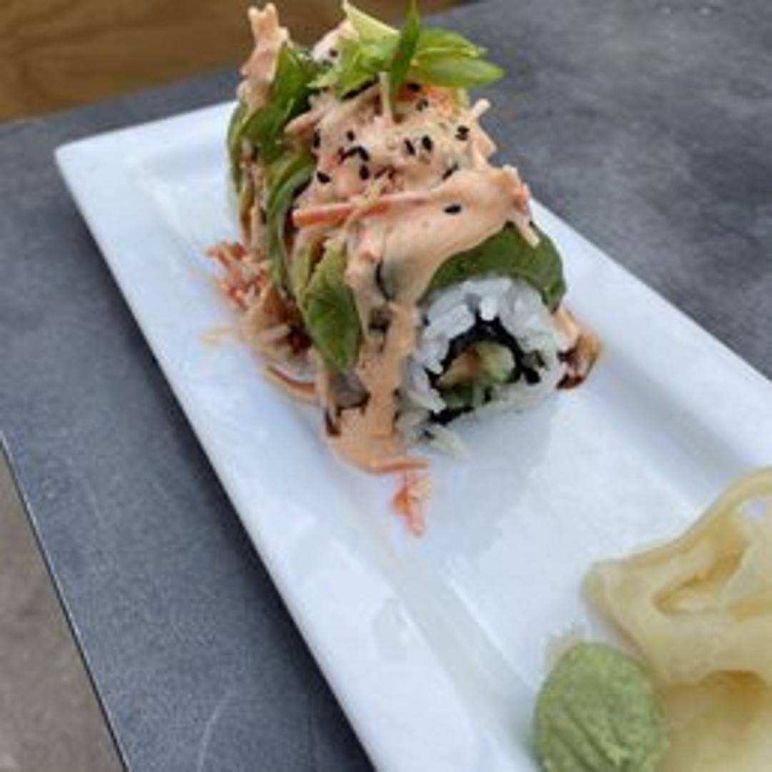A visually stunning and flavorful sushi masterpiece, often featuring an inner core of crispy tempura shrimp or succulent eel, topped with perfectly fanned slices of fresh avocado, artfully arranged to resemble a dragon's scales. Drizzled with a sweet eel sauce, it offers a harmonious blend of creamy, crunchy, and savory notes.
