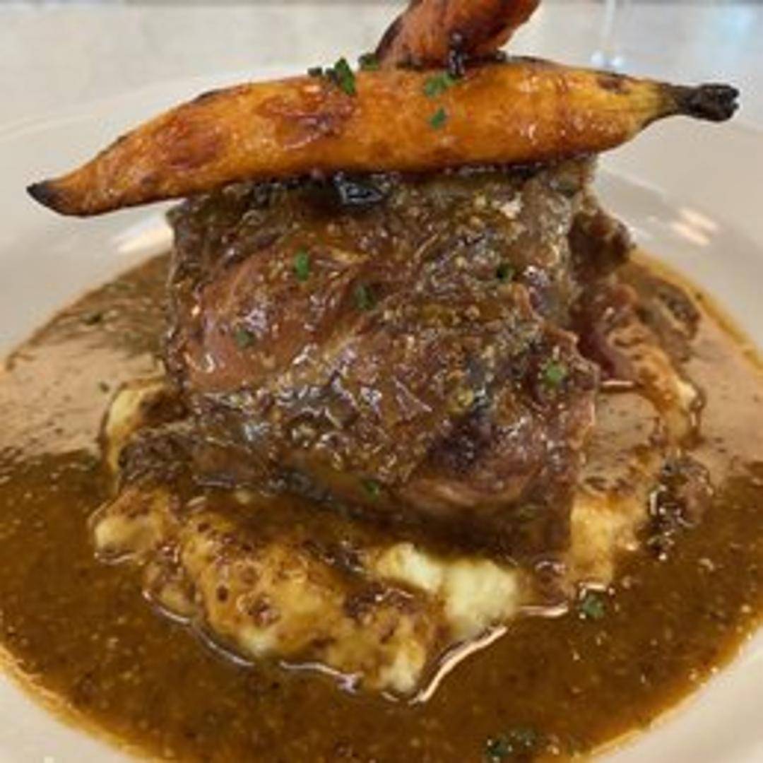 A robust and hearty cut of pork, slow-braised until exceptionally tender and falling off the bone, developing deep, savory flavors. Often served with rich pan jus and comforting root vegetables or potatoes.