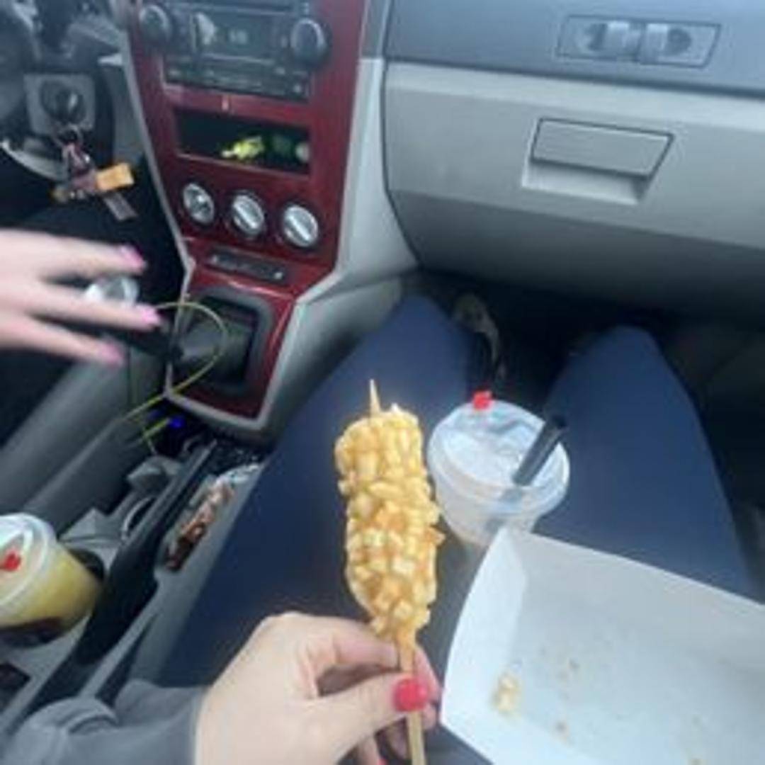 A hot dog coated in a layer of potato batter and fried until golden brown.