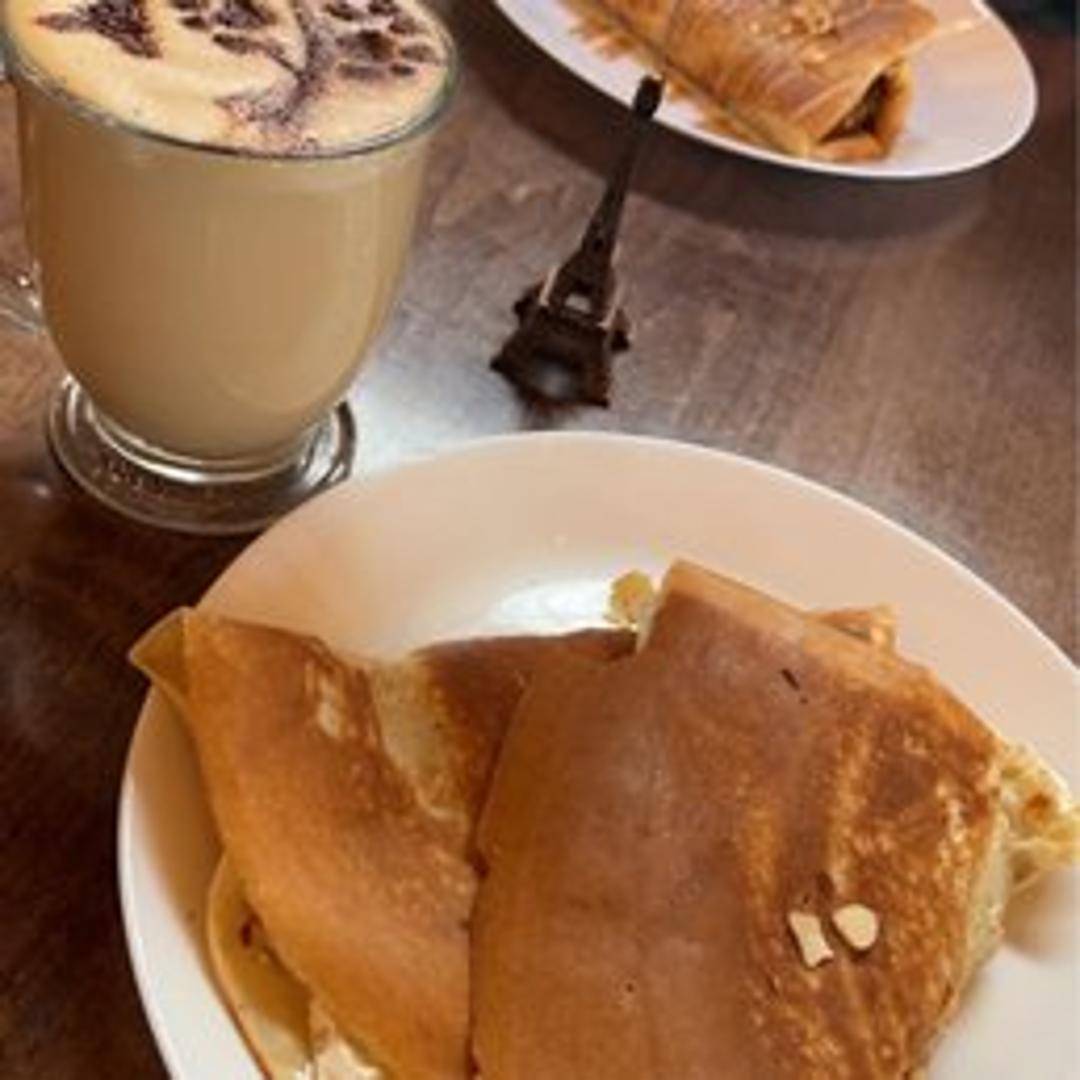 A creamy and decadent crepe featuring melted brie cheese and a drizzle of honey or a touch of fig jam for sweetness.