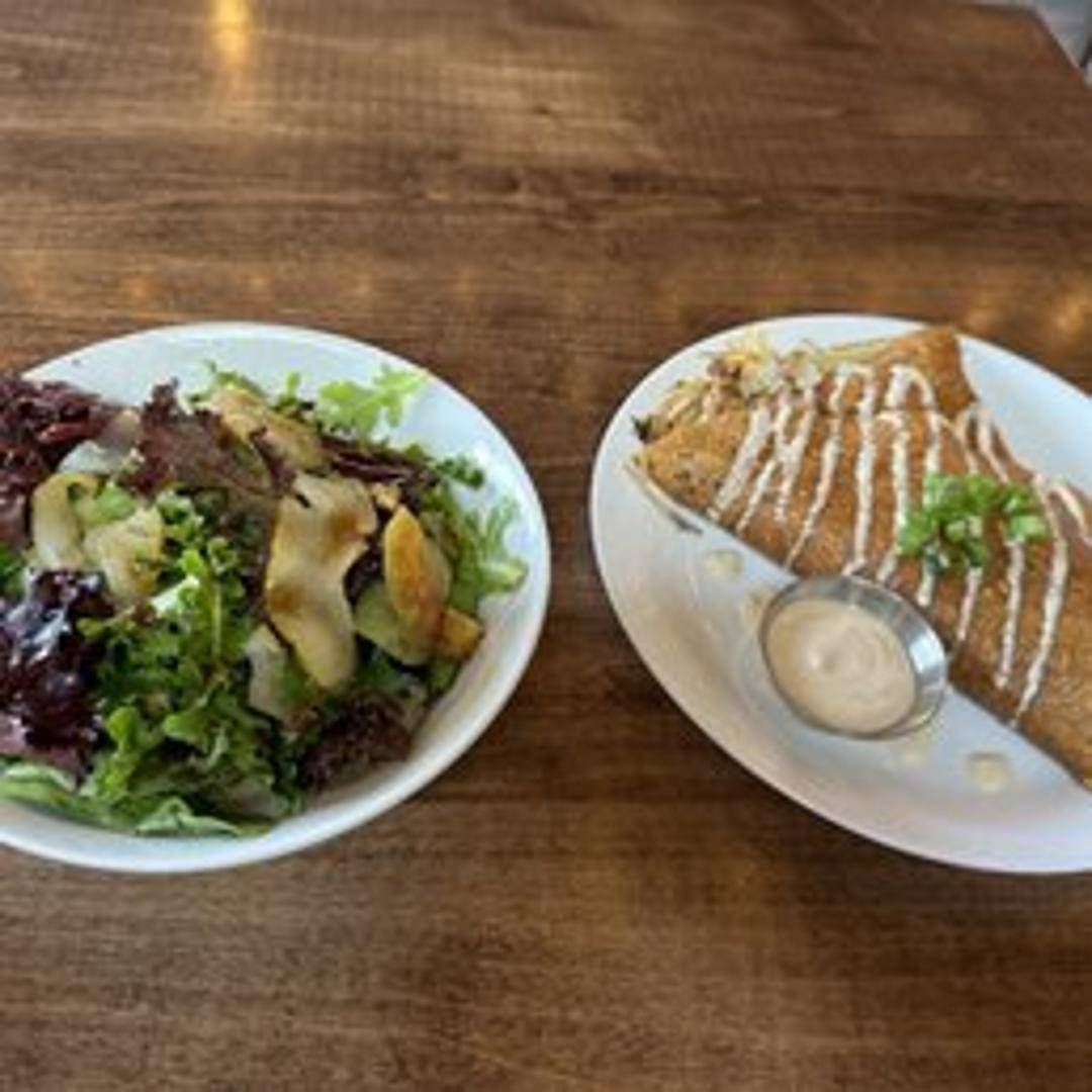 Savory crepe filled with a medley of sautéed mushrooms, garlic, herbs, and a touch of cream or cheese.