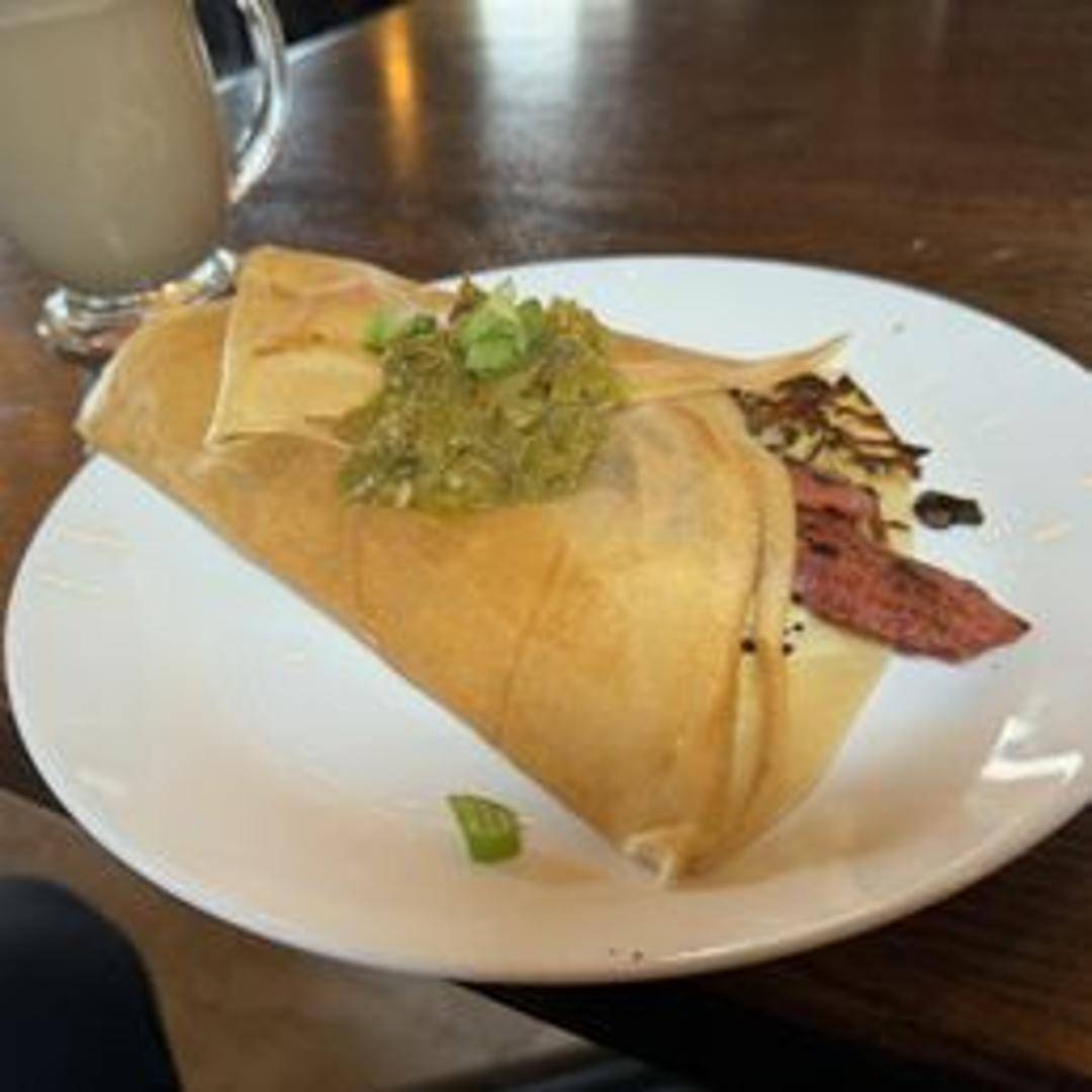 A savory crepe filled with scrambled eggs, melted cheese, and crispy turkey bacon. A satisfying and protein-packed meal.