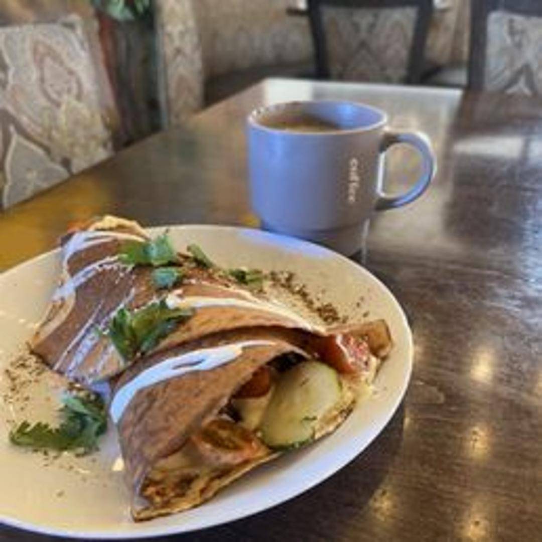 Savory crepe filled with feta cheese, olives, spinach, artichoke hearts, and a drizzle of olive oil and lemon juice.