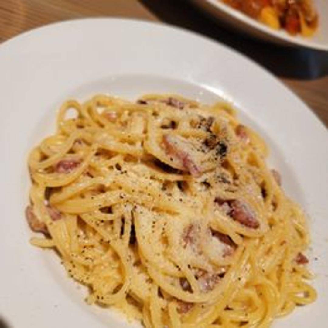 Authentic Spaghetti Carbonara, featuring al dente spaghetti tossed in a creamy sauce made with eggs, Pecorino Romano cheese, cured guanciale, and black pepper. A Roman classic.