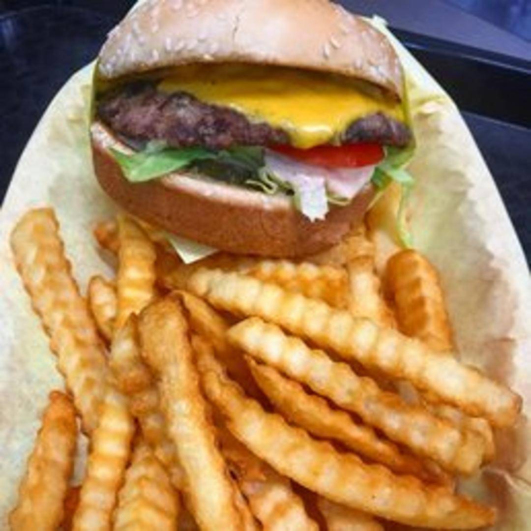 A classic cheeseburger featuring a juicy beef patty, melted cheese, crisp lettuce, ripe tomato, and sliced onion on a toasted bun. Condiments such as ketchup, mustard, and mayonnaise are available.