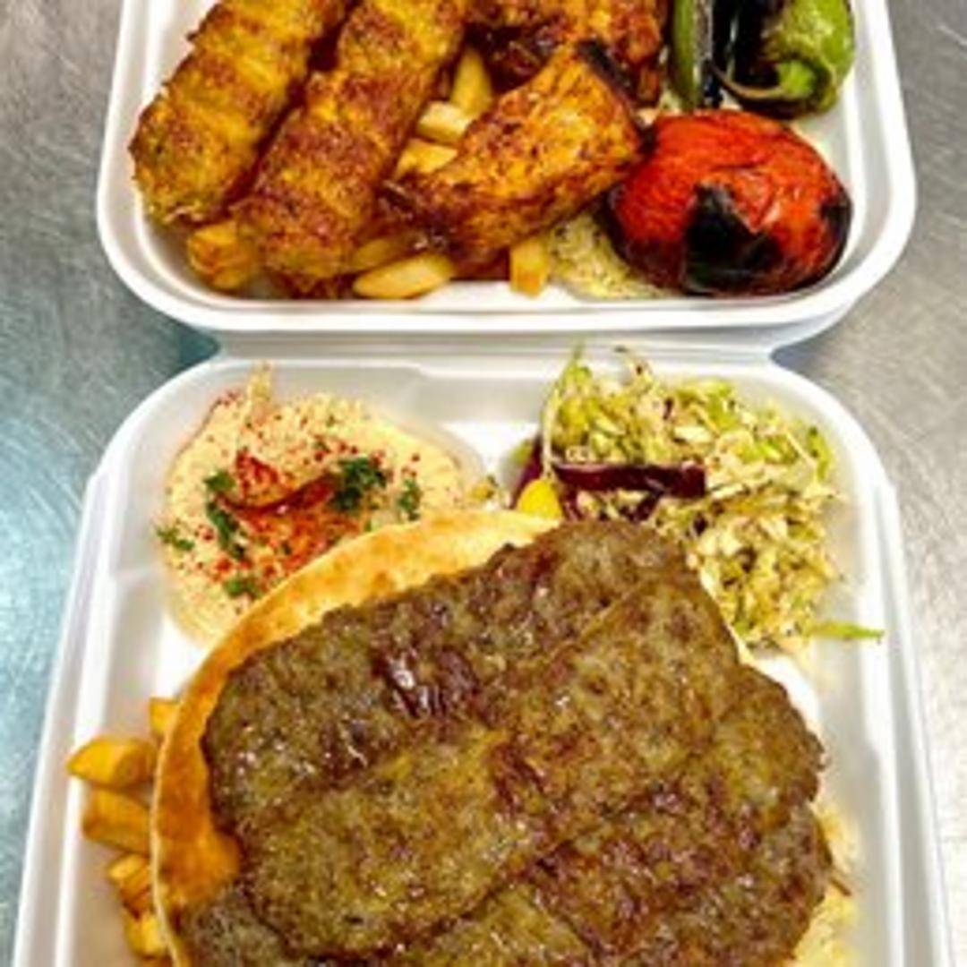 Savory, thinly sliced gyro meat (typically lamb or beef blend) served on a bed of warm pita bread. Accompanied by a refreshing tzatziki sauce, fresh tomatoes, onions, and your choice of side.