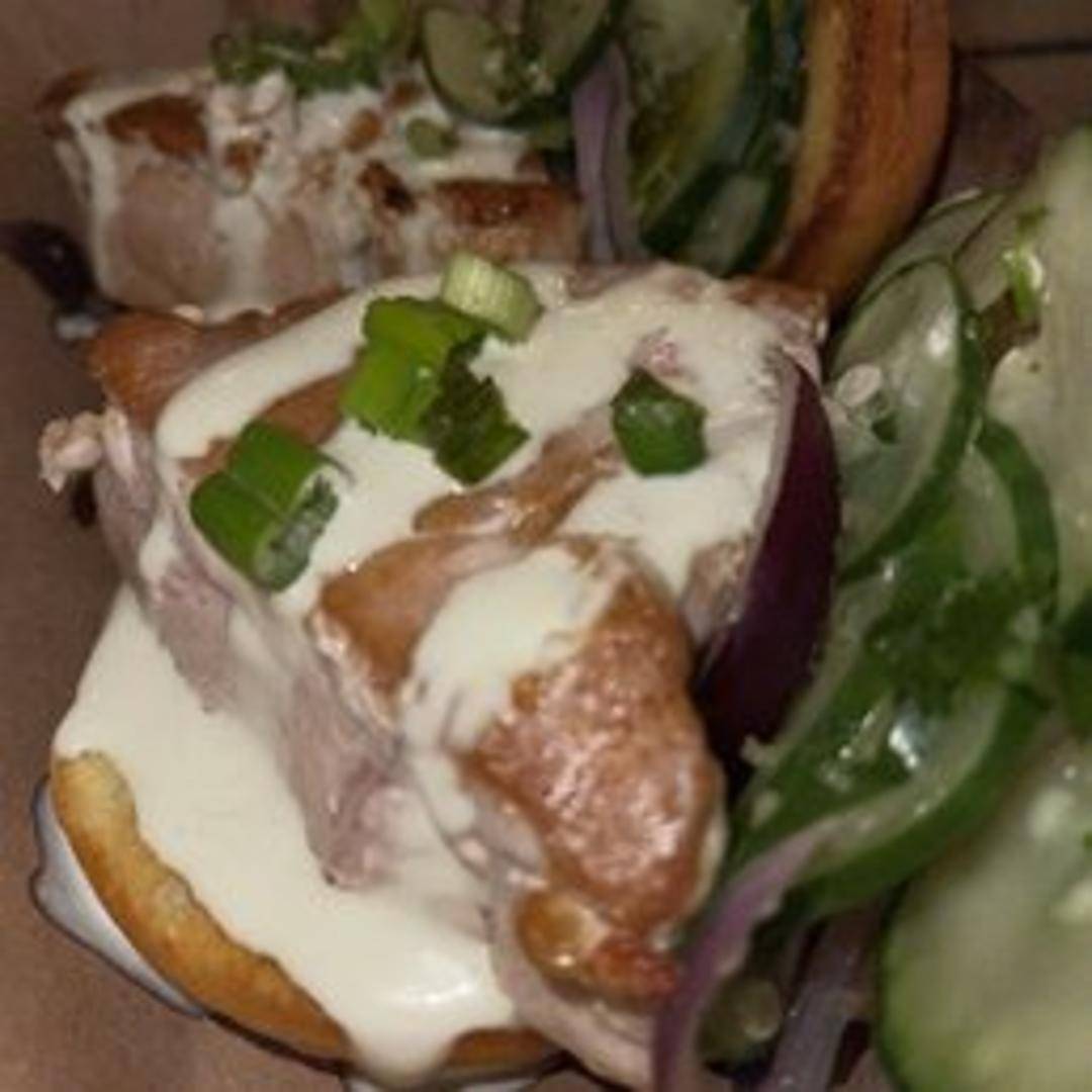 A miniature sandwich featuring flavorful tuna salad served on a soft slider bun. Contains lettuce and tomato and is typically served with a side of pickles.