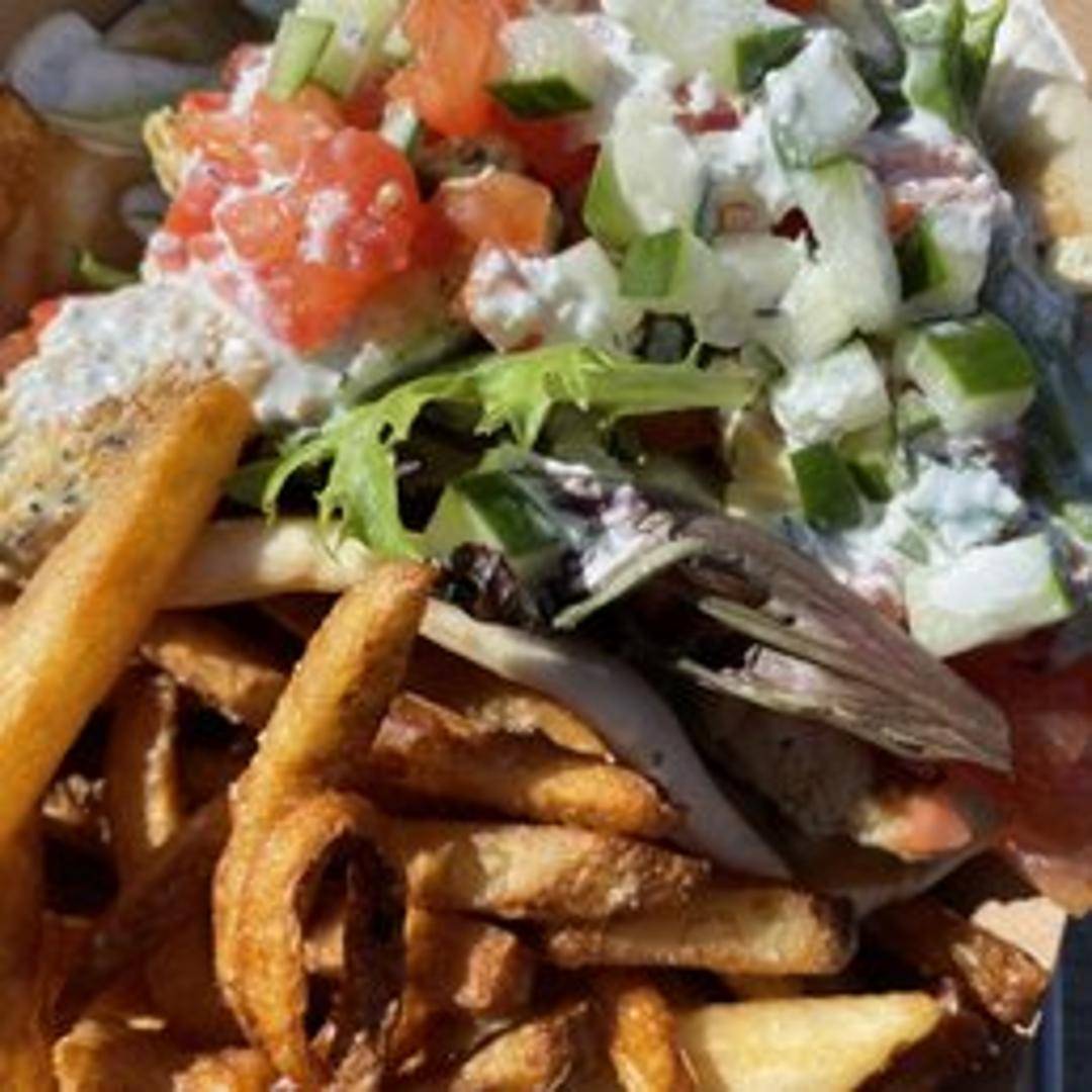 Thinly sliced, marinated chicken roasted on a vertical spit and served in a warm pita bread. Topped with tahini sauce, chopped tomatoes, onions, parsley, and pickled turnips. Served with a side of house-made hot sauce.