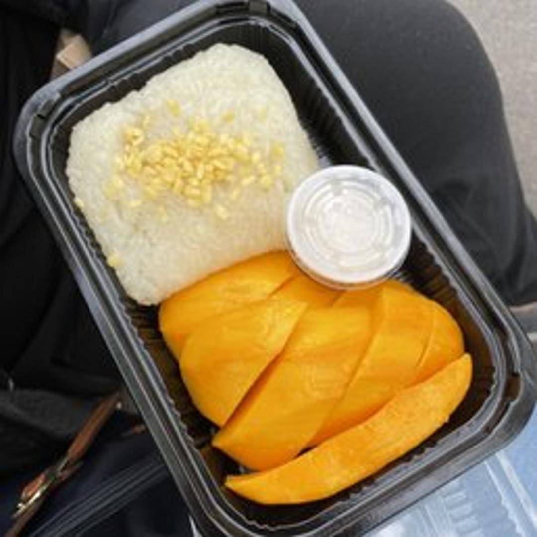 Sweet sticky rice cooked in coconut milk, topped with fresh, ripe slices of mango. A classic Thai dessert, perfect for a sweet treat. May contain traces of nuts.