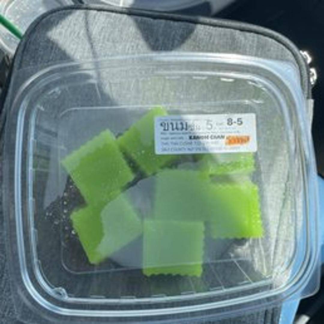 A colorful and visually appealing steamed layered cake made from rice flour, tapioca flour, coconut milk, and sugar. Each layer is typically cooked separately, creating a soft, chewy, and slightly sweet treat with a delicate coconut flavor. The layers are easily peeled apart and enjoyed one by one.