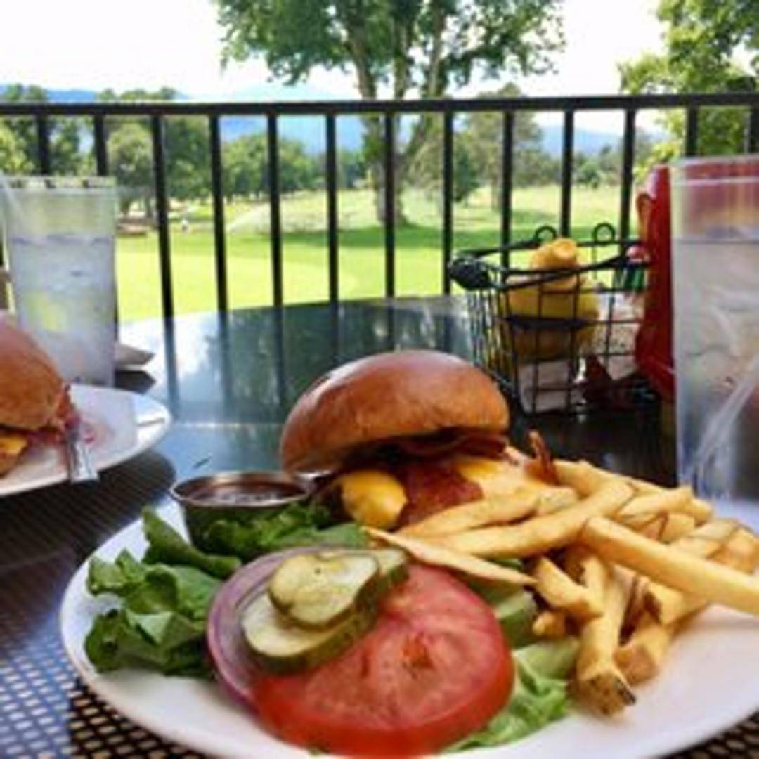 A juicy beef patty topped with crispy bacon, melted cheddar cheese, tangy BBQ sauce, lettuce, tomato, onion and pickles, served on a toasted bun.
